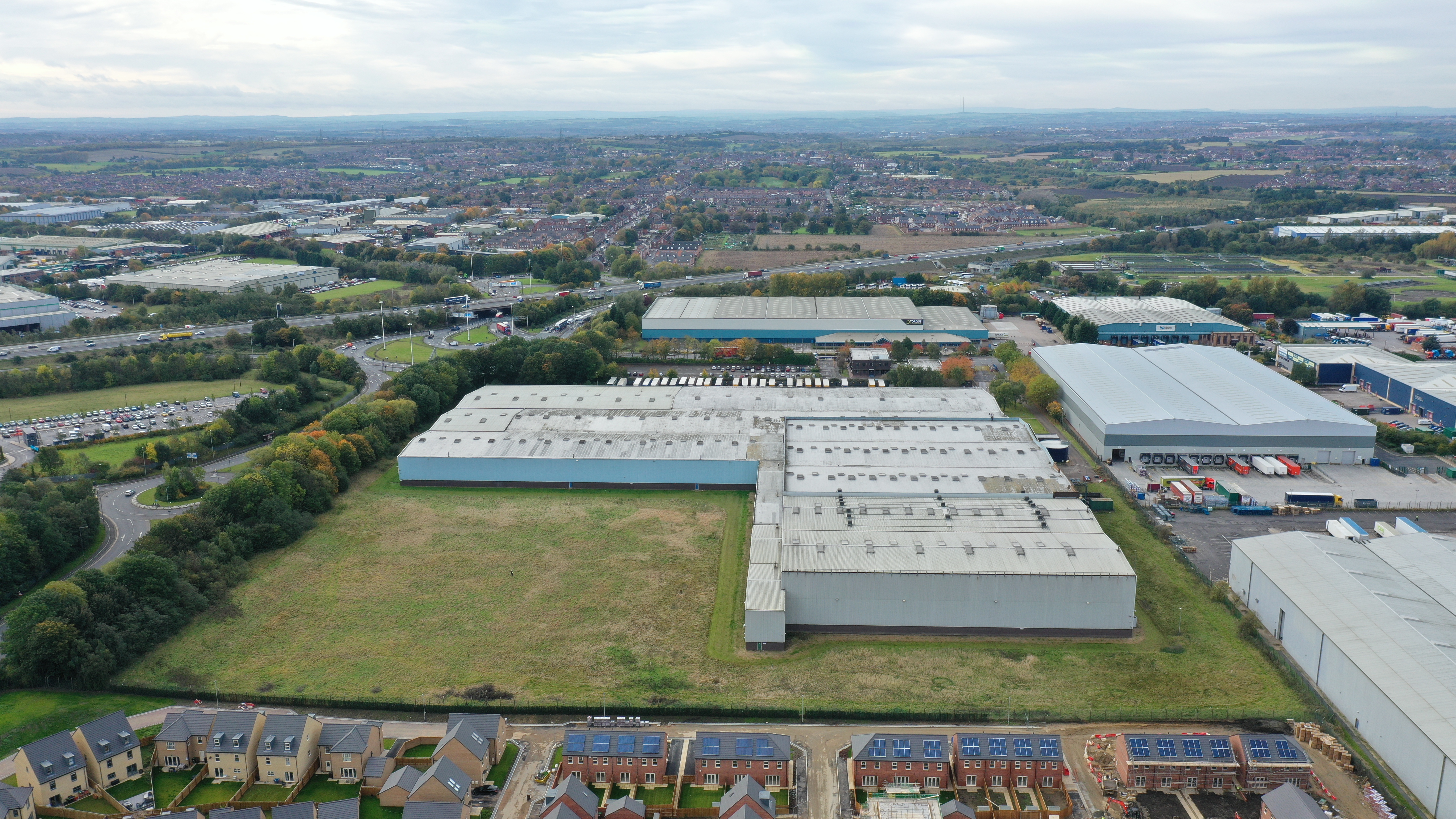 An aerial photograph of commercial industrial estate warehouses to be advertised in a commercial brochure giving that greater perspective of the site and surrounding location