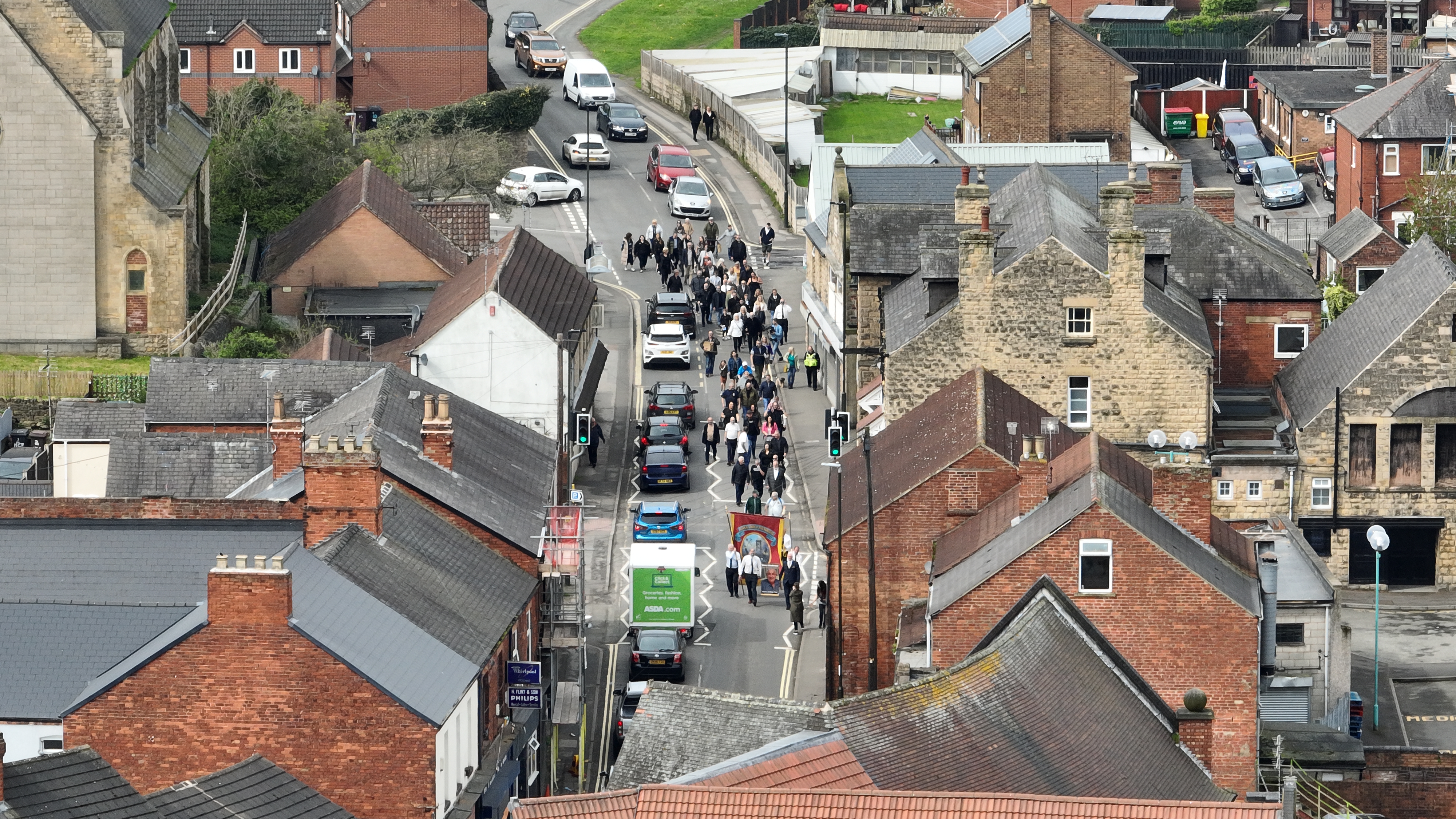 Miners unveiling day in Shirebrook town Drone filming the miner march through the Shirebrook town in Derbyshire and Nottinghamshire
